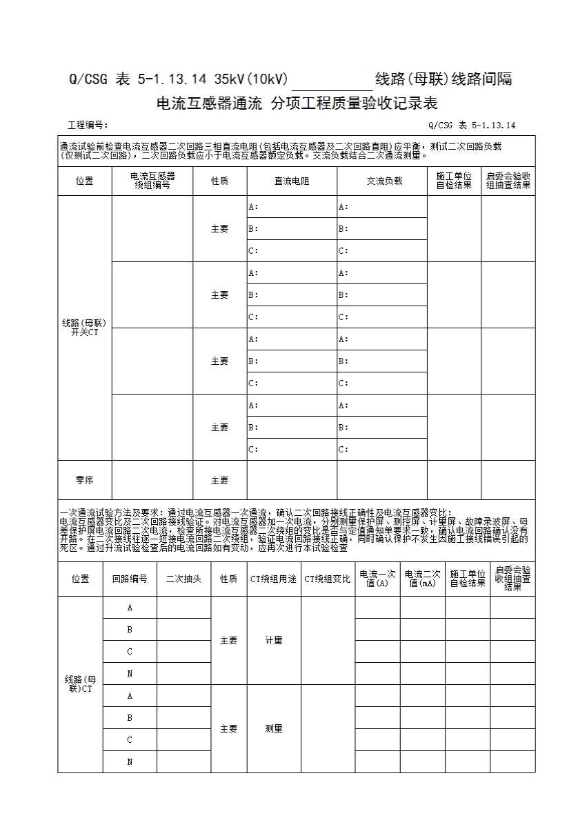 QCSG 表 5-1.13.14 35kV(10kV)______线路(母联)线路间隔电流互感器通流 分项工程质量验收记录表