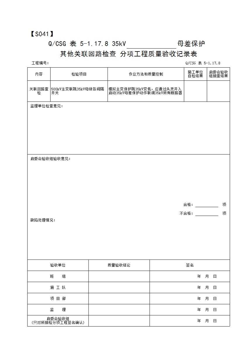 表格名称:QCSG 表 5-1.17.8 35kV______母差保护其他关联回路检查 分项工程质量验收记录表