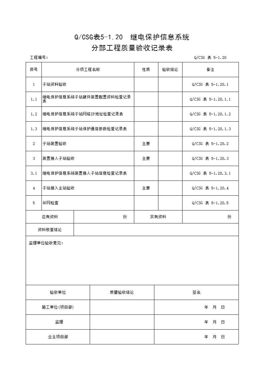 表格名称:QCSG 表 5-1.20 继电保护信息系统 分部工程质量验收记录表
