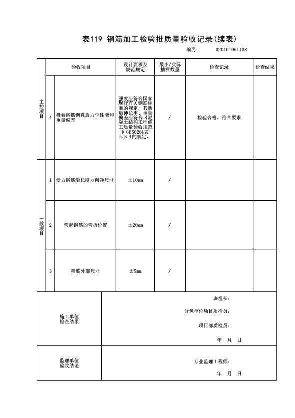 表格名称:020101061108 钢筋加工检验批质量验收记录