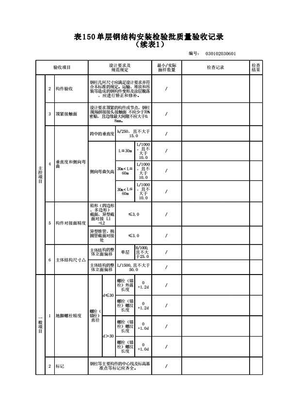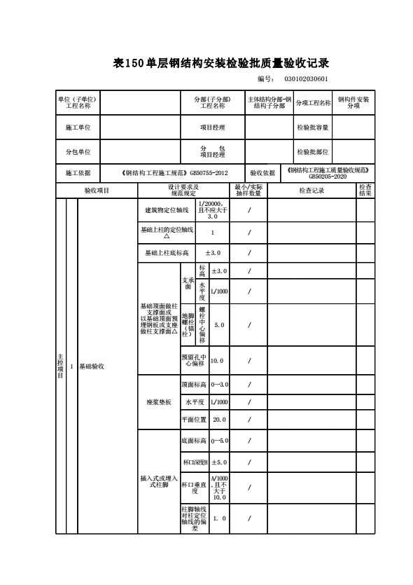 表格名称:030102030601 单层钢结构安装检验批质量验收记录