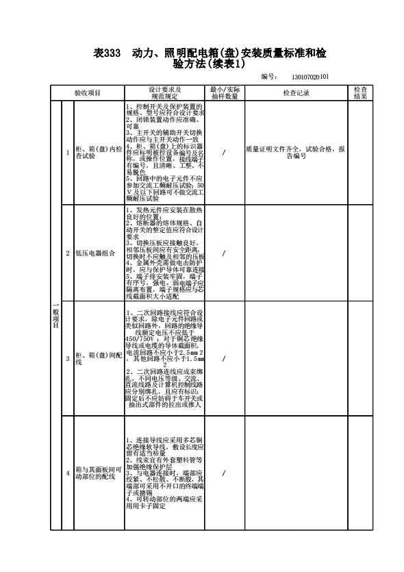 表格名称:130107020101 动力、照明配电箱(盘)安装质量标准和检验方法