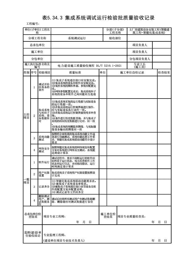 表格名称:表5.34.3 集成系统调试运行检验批质量验收记录