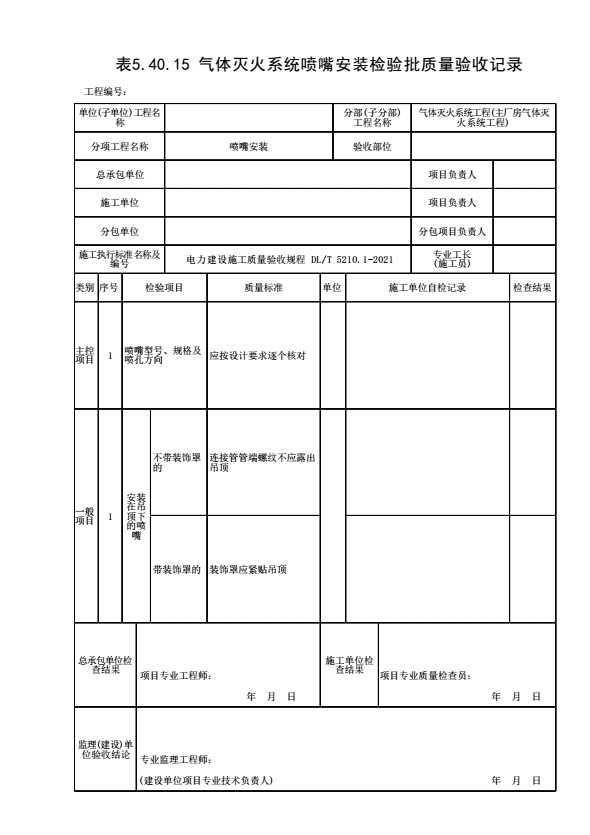 表格名称:表5.40.15 气体灭灭系统喷嘴安装检验批质量验收记录