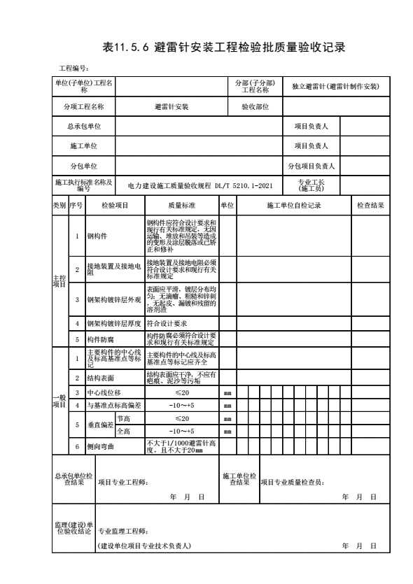 表格名称:表11.5.6避雷针安装工程检验批质量验收记录