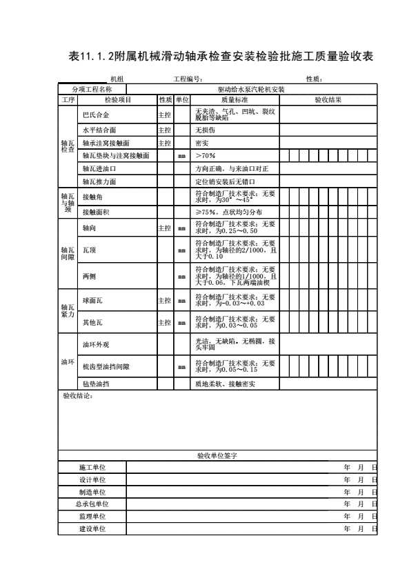 表格名称:表11.1.2 附属机械滑动轴承检查安装检验批施工质量验收表