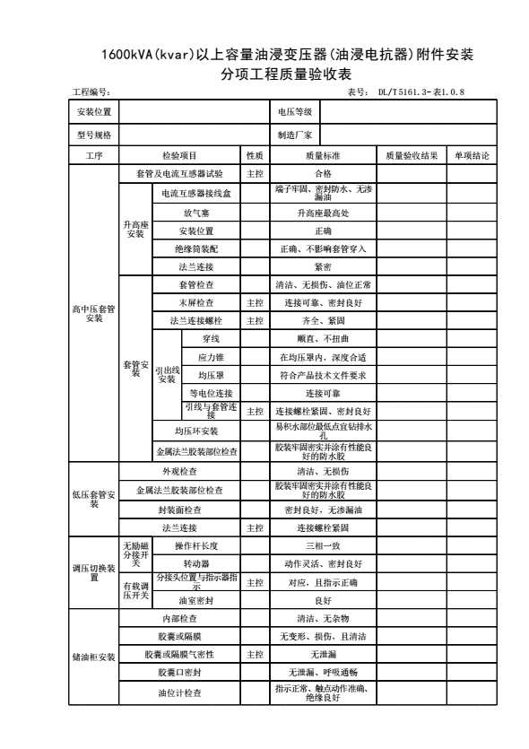 表格名称:表1.0.8 1600kVA(kvar)以上容量油浸变压器(油浸电抗器)附件安装分项工程质量验收表