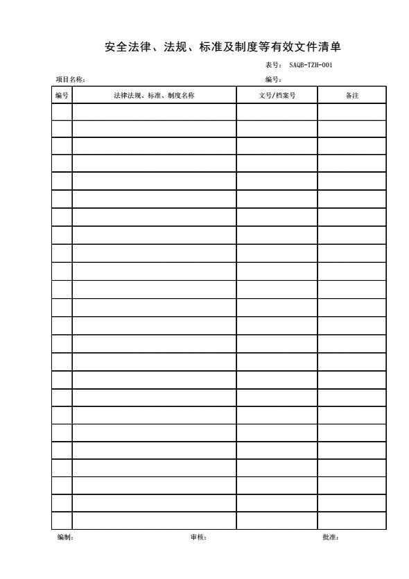 表格名称:SAQB-TZH-001 安全法律、法规、标准及制度等有效文件清单