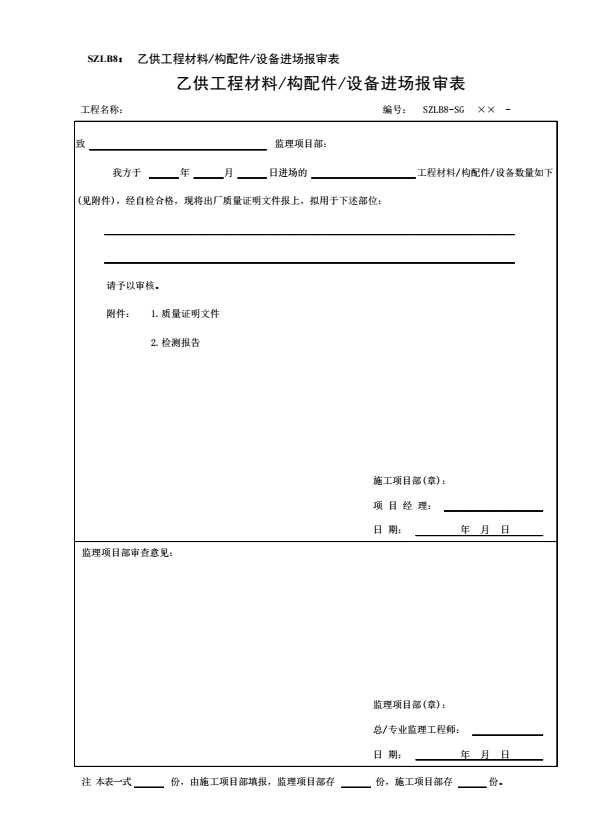 表格名称:SZLB8:乙供工程材料构配件设备进场报审表