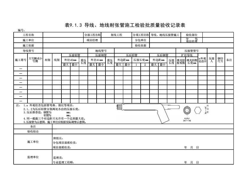 表格名称:表9.1.3 导线、地线耐张管施工检验批质量验收记录表