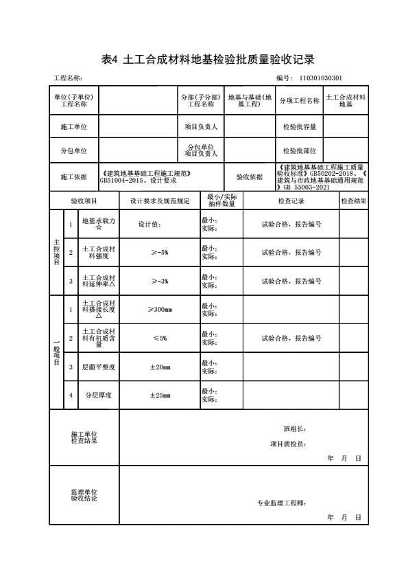表格名称:110301030301 土工合成材料地基检验批质量验收记录