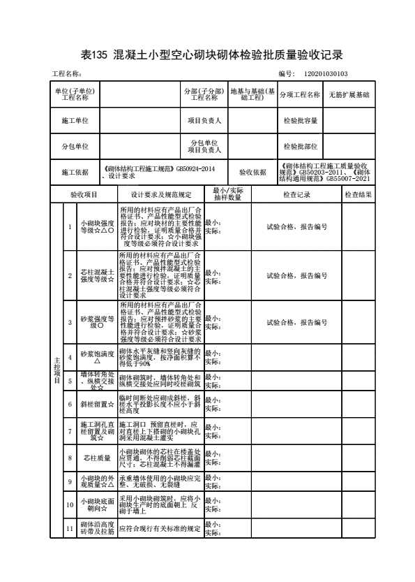 表格名称:120201030103 混凝土小型空心砌块砌体检验批质量验收记录