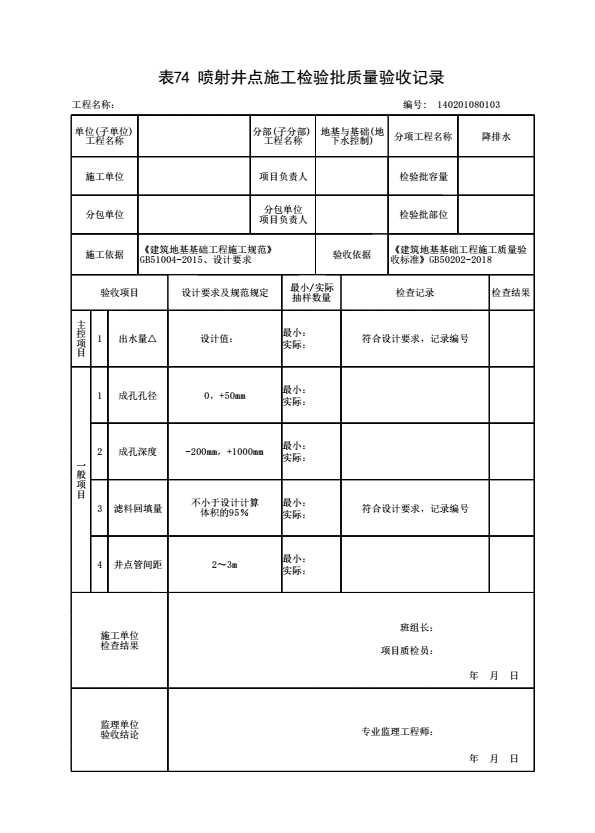 表格名称:140201080103 喷射井点施工检验批质量验收记录