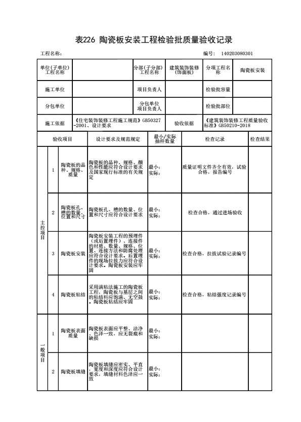 表格名称:140203080301 陶瓷板安装工程检验批质量验收记录
