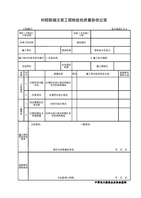 表格名称:电土验表5.8.2 衬砌裂缝注浆工程检验批质量验收记录