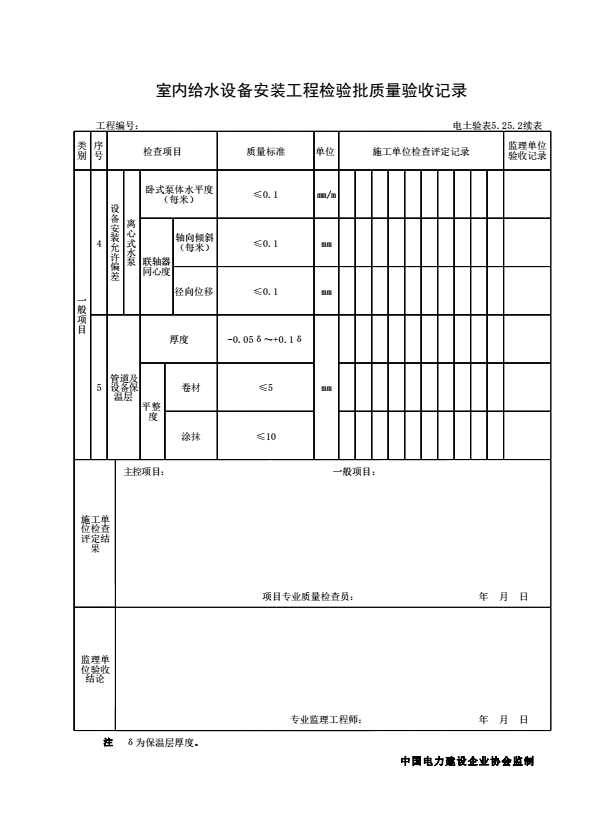 表格名称:电土验表5.25.2 室内给水设备安装工程检验批质量验收记录