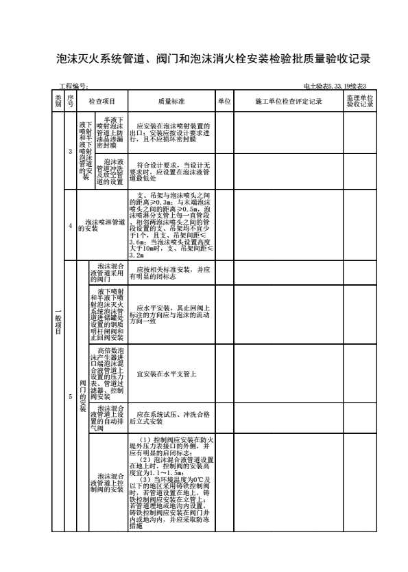 表格名称:电土验表5.33.19 泡沫灭火系统管道、阀门和泡沫消火栓安装检验批质量验收记录