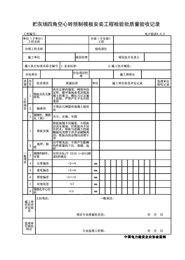 表格名称:电土验表8.6.2 贮灰场四脚空心砖预制模板安装工程检验批质量验收记录