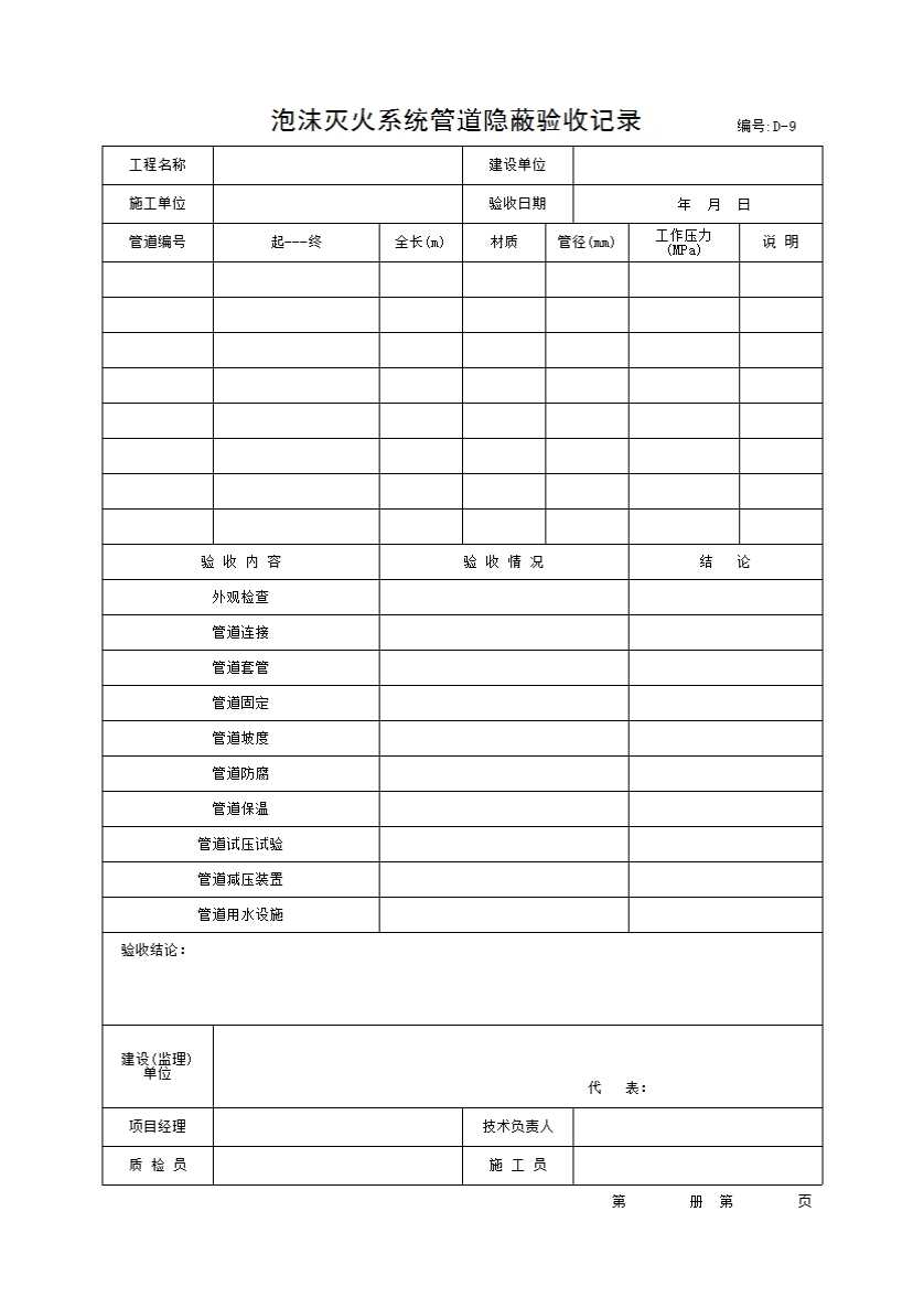 表格名称:泡沫灭火系统管道隐蔽验收记录