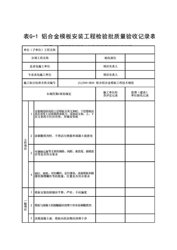 表格名称:表G-1 铝合金模板安装工程检验批质量验收记录表