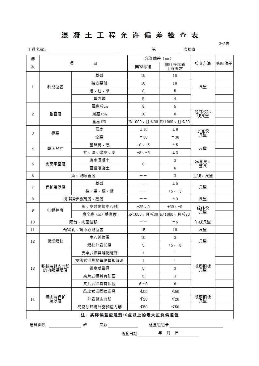 2-2混凝土工程允许偏差检查表