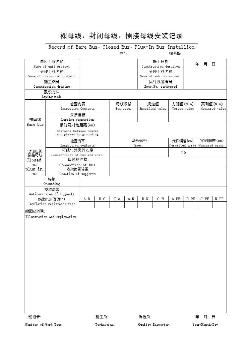 表格名称:裸母线、封闭母线、插接母线安装记录