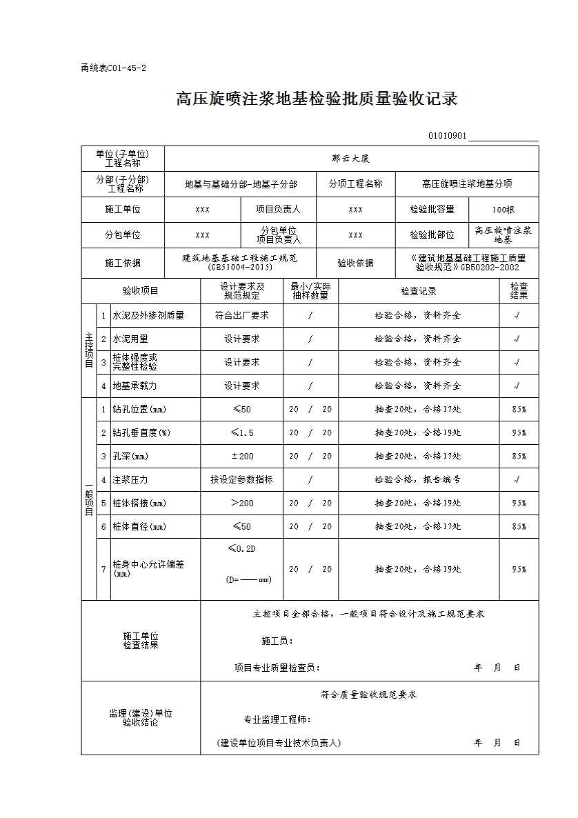 4.1.7 除本规范第4.1.5、4.1.6条指定的主控项目外,其他主控项目及一般项目可随意抽查,但复合地基中的水泥土搅拌桩、高压喷射注浆桩、振冲桩、土和灰土挤密桩、水泥粉煤灰碎石桩及夯实水泥土桩至少应抽查20%。