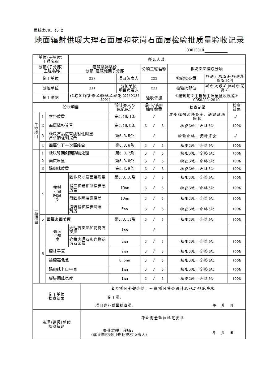 6.3.5 大理石、花岗石面层所用板块产品进入施工现场时,应有放射性限量合格的检测报告。