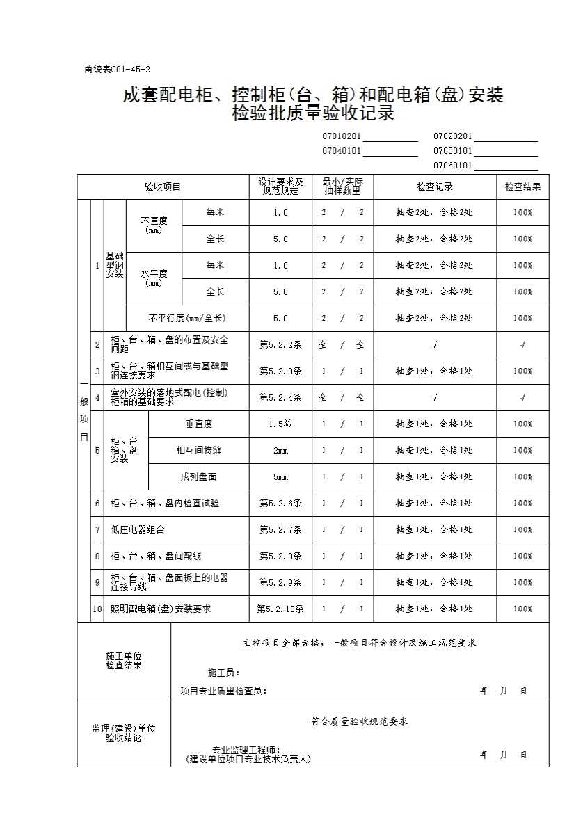 07060101_成套配电柜、控制柜(台、箱)和配电箱(盘)安装检验批质量验收记录
