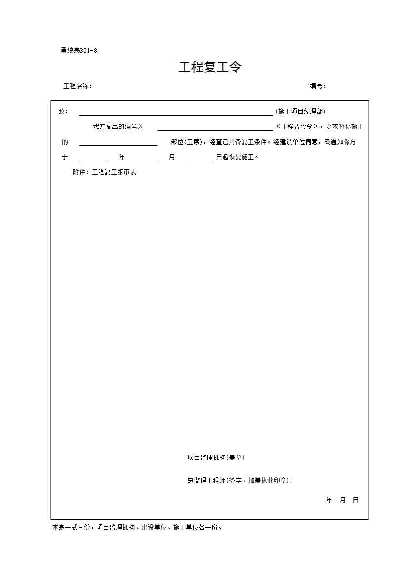 表格名称:B01-8 工程复工令