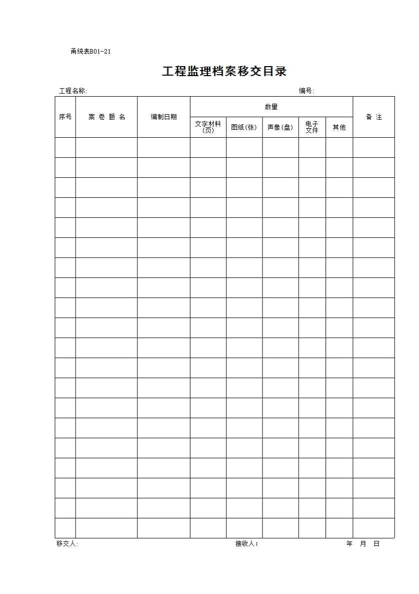 表格名称:B01-21 工程监理档案移交目录