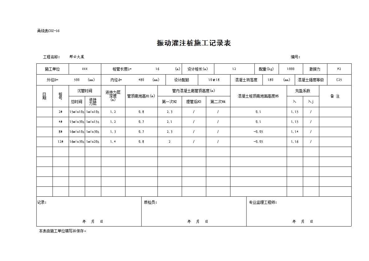 C02-16 振动灌注桩施工记录表