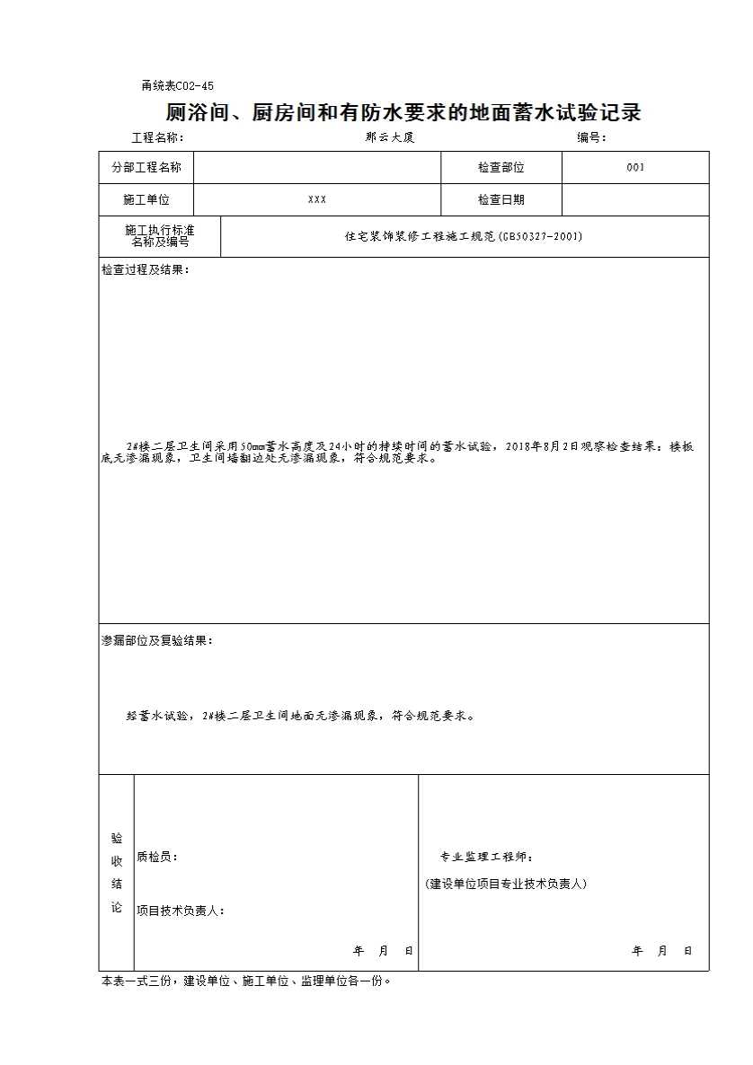 C02-45 厕浴间、厨房间和有防水要求的地面蓄水试验记录