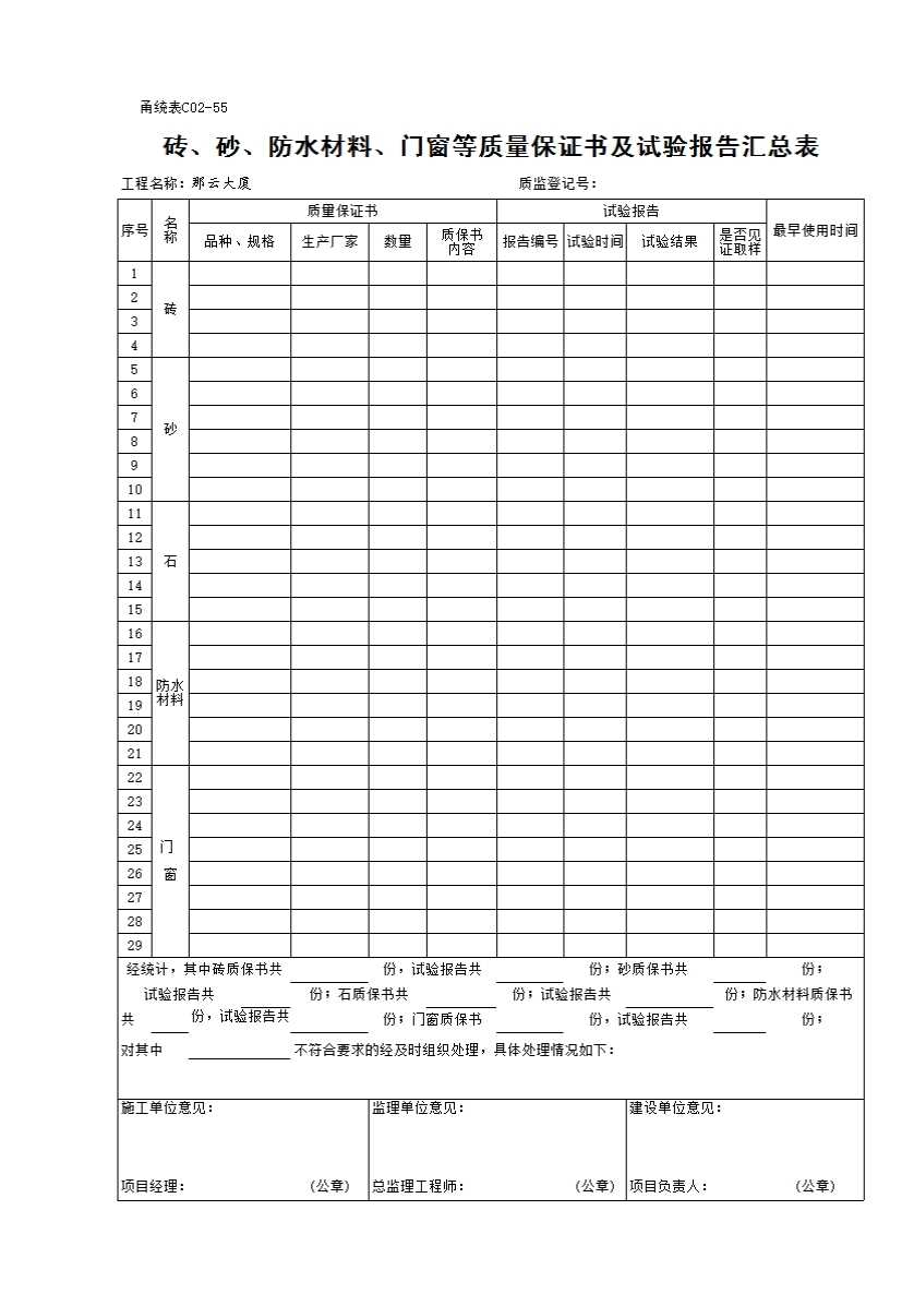 表格名称:C02-55 砖、砂、防水材料、门窗等质量保证书及试验报告汇总表