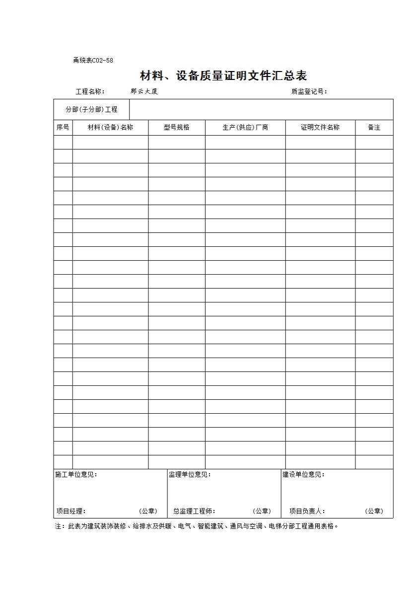 表格名称:C02-58 材料、设备质量证明文件汇总表