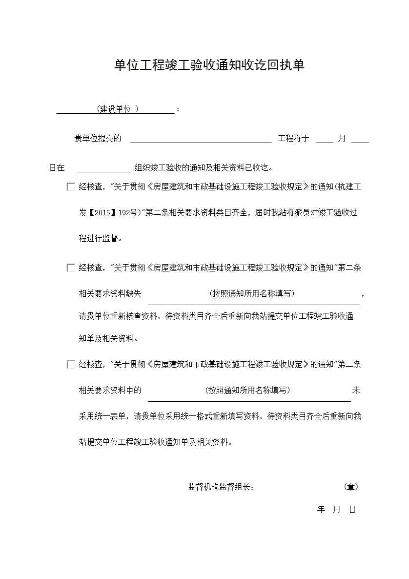 表格名称:附表12 单位工程竣工验收通知收讫回执单