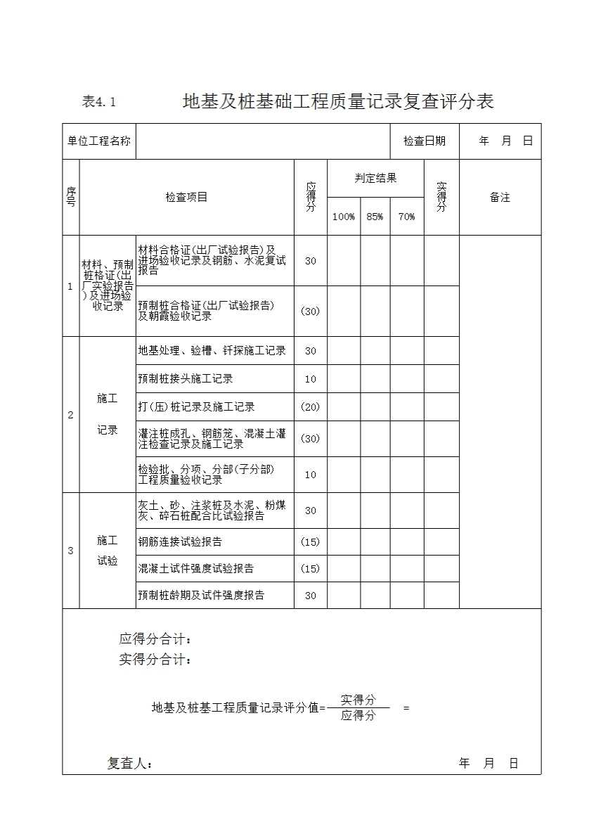 地基及桩基础工程质量记录复查评分表
