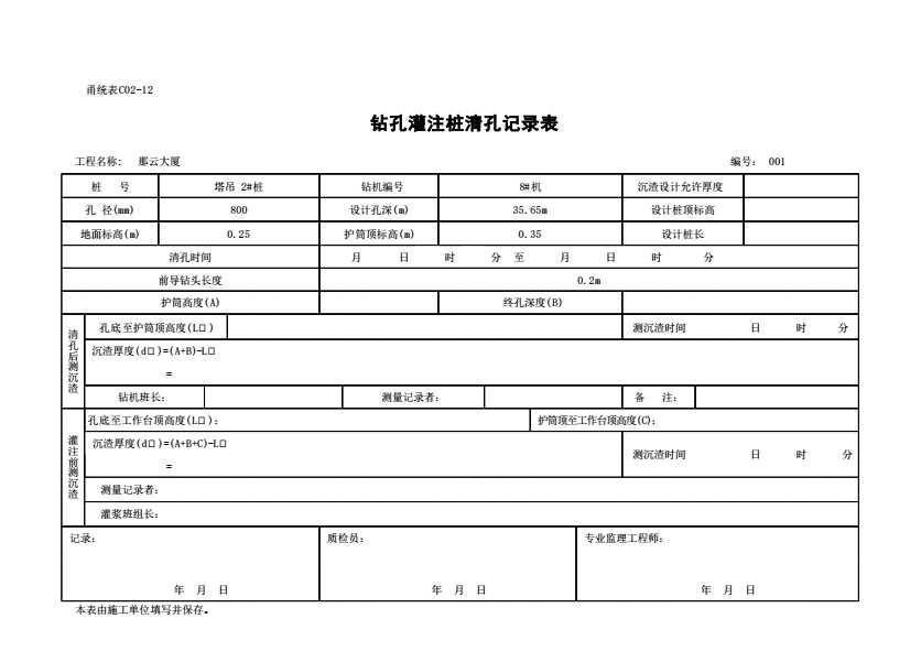 表格名称:C02-12 钻孔灌注桩清孔记录表