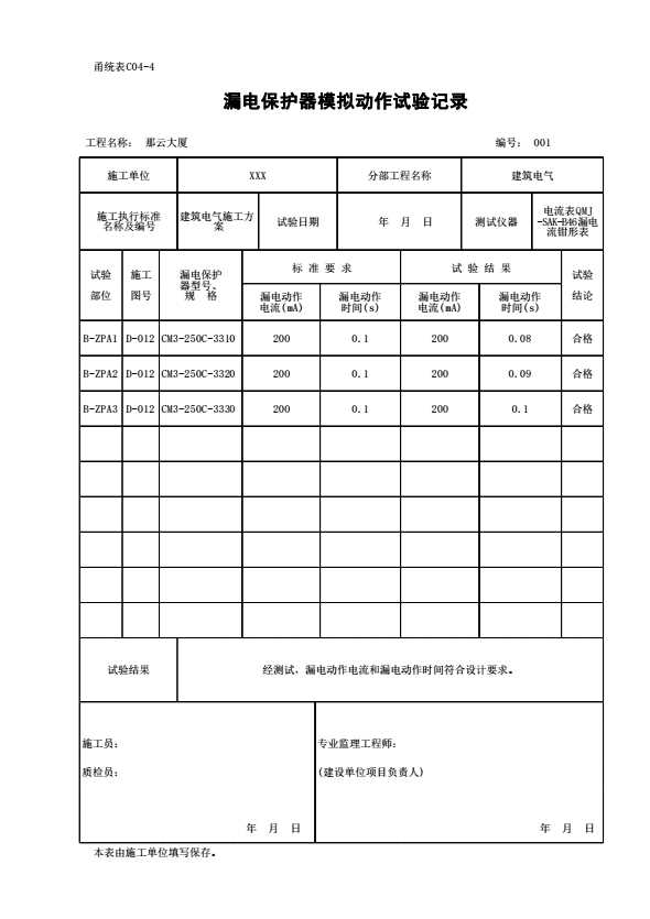 表格名称:C04-4 漏电保护器模拟动作试验记录