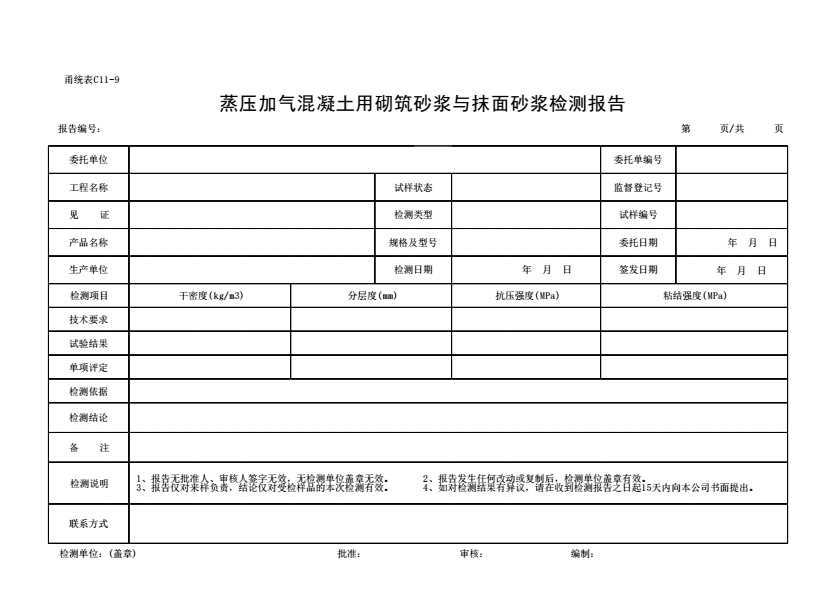 表格名称:C11-9 蒸压加气混凝土用砌筑砂浆与抹面砂浆检测报告