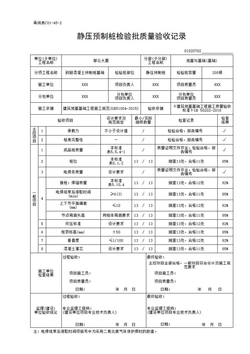 5.5.2 施工中应检验接桩质量、锤击及静压的技术指标、垂直度以及桩顶标高等。