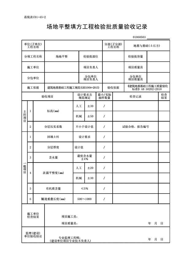 表格名称:01060503_场地平整填方工程检验批质量验收记录