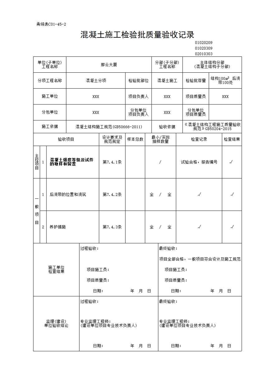 混凝土施工检验批质量验收记录