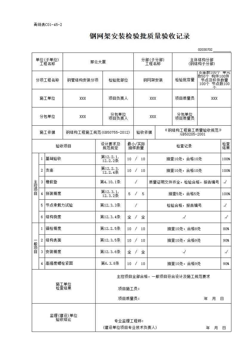 钢网架安装检验批质量验收记录