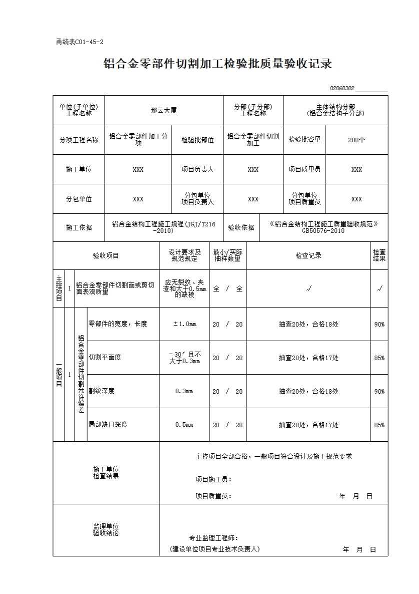 02060302_铝合金零部件切割加工检验批质量验收记录