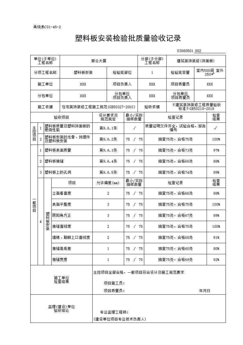塑料板安装检验批质量验收记录