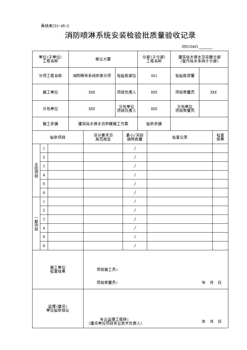 表格名称:05010401_消防喷淋系统安装检验批质量验收记录