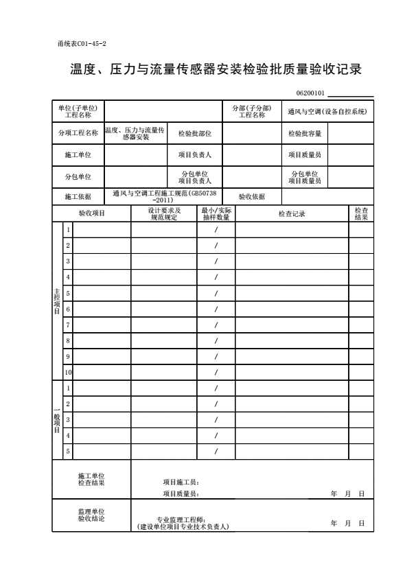 表格名称:06200101_温度、压力与流量传感器安装检验批质量验收记录