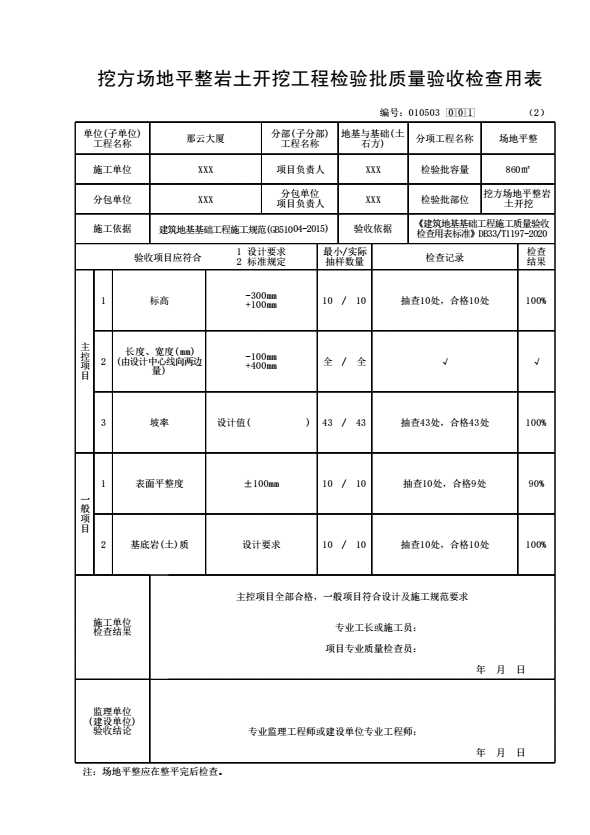 挖方场地平整岩土开挖工程检验批质量验收记录