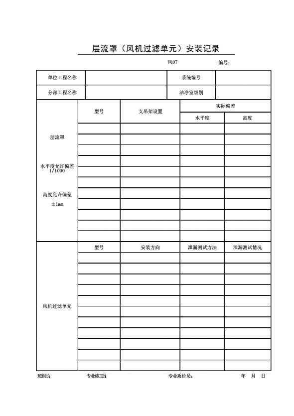 表格名称:风07 层流罩(风机过滤单元)安装记录